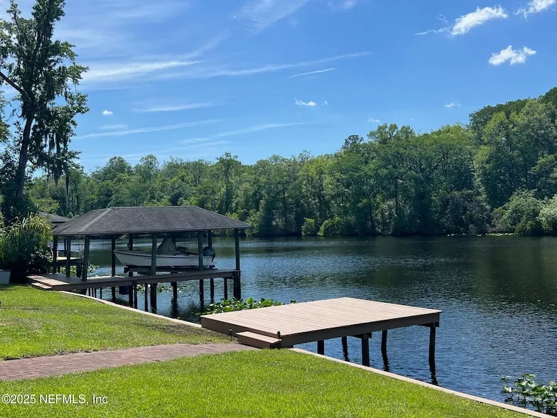 Don't miss this beautiful Black Creek home and get ready to be a part of Creek life! This property has it all with spectacular views of Black Creek in the backyard, and a fishing lake in the front yard! The property features a dock with covered slip and boat lift, wood bulkhead, an additional fishing dock, a boat shed for kayaks and all other aquatic equipment, a generous separate workshop/garage with concrete floor, a concrete block oversized two car garage and covered RV parking garage. The inside the home is well kept and has three bedrooms and two baths in a thoughtfully arranged open plan on one level with a large glassed-in Florida room over looking the water and a patio beyond. Imagine, having your coffee with deep water Black Creek in the backyard, and nothing but trees on the other side (Fla. Land Trust property) and it is just a short boat ride connecting to the St. Johns Rive...