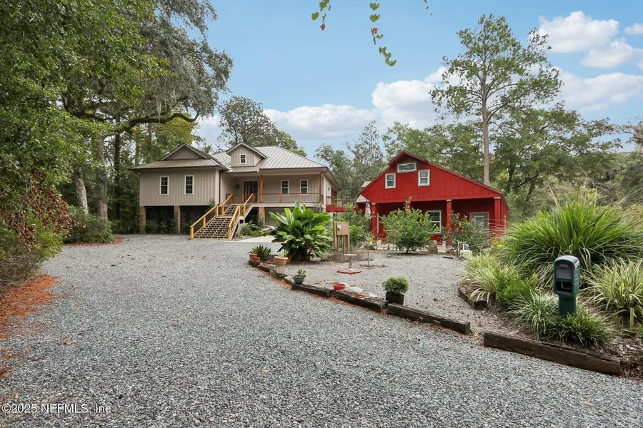 Welcome to your own private waterfront retreat! Set on a spacious and secluded lot, this home has been completely built new from the ground up and offers 2 living areas! Inside the main home, you'll find rich hardwood floors, exposed wood ceiling, an inviting living space that flows effortlessly to both a welcoming front porch and a relaxing back porch with serene water views. The property is designed for convenience and versatility, featuring a garage with an elevator that carries you directly to the top level of the home. A separate non conforming 3rd bedroom/guest suite above the huge detached studio/garage space offers its own private bath and washer/dryer, ideal for visitors or extended stays. The estate includes a huge workshop and an air-conditioned garage/studio space perfect for hobbies or creative pursuits. Outdoor living shines with a large screened patio equipped with water and electricity, as well as a private boat dock for access to the water, to the St Johns River.