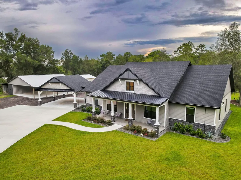 This beautiful newly built home with its carport, 3 car garage, and pole barn with enclosed storage totals over 7,300 square feet under roof. If privacy is what you are after it is located on a very secluded 4.88 acres just off Immokalee Road minutes outside of Keystone Heights city limits. This custom-built home by Denmark Builders has 2,891 square feet of heated and cooled space with 4 bedrooms and 3 baths and an office that could be used as an additional bedroom if needed. The front foyer greets you with 19' high cathedral ceilings with faux wood beams spanning the living area and kitchen. The kitchen has all Kitchen-Aid appliances, including a gas range with a cooktop and an electric convection wall oven/microwave combo. The kitchen is complete with Granite counters and a large island with lots of bar seating. Other propane gas-powered items include the massive stone fireplace in the living room and the Ranai tankless water heater. The guest side of the home includes 3 bedrooms all with adequate size closets and 2 full baths. The master suite has his and her closets with a large walk-in shower with multiple shower heads. The house has plenty to offer on the technology side also with a multi-zone ceiling speaker system, Ring alarm with Ring flood cameras and ethernet/coax ran to multiple locations for any future needs. The home is serviced by ATT with 1GB Fiber internet but can also have Xfinity service. The electrical service was upgraded to 400-amps with a full 200-amp service dedicated to the shop area. The 3-car metal garage area is 1500 sf while the pole barn with lean-to's totals around 2000 sf. The property also has a nice little mile-walking trail, a small shooting berm, and a dog kennel.