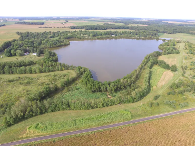 This tract lays level to slightly rolling and is improved with a beautiful established lakefront building location with an older garage and pole barn situated at the end of a long private driveway.