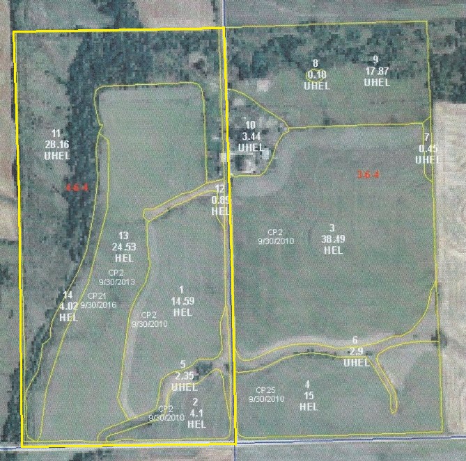 The 24.53 acres CRP of the cropland fields expires in 2013, and has a payment rate of $48.00 per acre. The 18.69 acres CRP expires in 2020, and has a payment rate of $48.00 per acre. The 4.02 acres buffer strip CRP expires in 2016, and pays $78.20 per acre. The 18.69 acres CRP with an expiration date of 2020 could be terminated immediately and turned into cropland by paying back 25% of one year’s payment, or $12 per acre. The soils on the CRP land are about ½ Hobbs silt loam along the creek and ½ gently sloping Crete silt loam on the upland. The native grass CRP has been nicely maintained and enhanced with several food plots along the field borders. This farm’s habitat is excellent for bobwhite quail, pheasant, whitetail deer, turkey, and other wildlife. The 2009 taxes were $443.50.