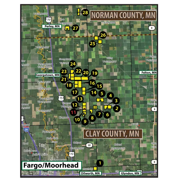 Auction Note: This offering features exceptional cropland and a large-scale Bin and Dryer Complex in Clay and Norman Counties and potential development land at Dilworth Minnesota. There are 28 parcels ranging in sizes from 80 +/- acres to 320 +/- acres; 25 of the 28 parcels have a Soil Productivity Index over 90!! This land has a strong cropping history with consistently strong and proven yields in corn, soybeans, sugarbeets, wheat, sunflowers and barley!