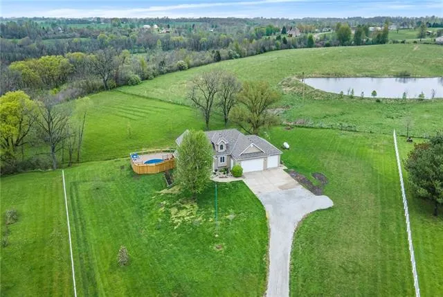Move-in ready reverse 1.5 stories on 2.5 acres! Greeted into a foyer opening up to a spacious main level. Bedroom ideal for office space on the front of home & full bath. Living room complete w/ vaulted ceilings, custom built-in, & wood floors. Living room open to dining space & kitchen. The kitchen boasts a walk-in pantry, island, tile backsplash, gas range, & new slate appliances. Primary bedroom w/ en-suite. The en-suite has dual vanities, a tiled walk-in shower, & 11x8 walk-in closet. Main-level laundry room. Over-sized three-car garage w/ 3rd bay at 30 ft w/ 8 ft door. Walk out onto a 32x10 covered deck. Lower level of the home is ideal for 2nd living quarters. Family room, 2nd kitchen, 3rd bedroom w/ en-suite & 4th bedroom. The lower level walks out to the patio area. 3 large storage rooms. Above ground salt water pool w/ new Trex deck surround & privacy vinyl wall. Long driveway w/ space to add a building by the home. Home situated in a dead-end neighborhood at the back end of a cul-de-sac. new siding, gutters, and roof in 2020. New interior paint. Non-HOA neighborhood. Quick proximity to Kearney or Liberty!