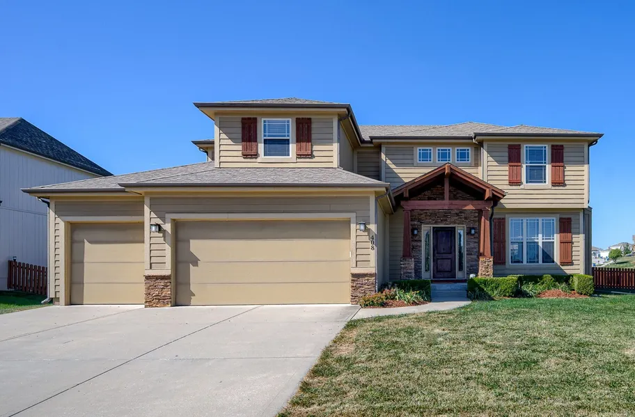 This two-story home on a corner, cul-de-sac lot boasts a range of features that make it an ideal place to call home. The grand entry welcomes you into the main level with wood flooring, an upgraded trim package, wood blinds, drop zone, formal dining, and a half bath. One of the highlights of this home is the kitchen, equipped with an island, granite countertops, walk-in pantry, stainless appliances, abundance of storage and walks out to a covered, stamped concrete patio. The heart of this house is undoubtedly the living room, where you’ll find a cozy gas fireplace that’s perfect for chilly evenings, built-in custom cabinetry and a wall of windows allowing natural light to pour into the space. Upstairs you will find four bedrooms and two full bathrooms. The large primary bedroom and bathroom features vaulted ceilings, dual vanity, jetted tub, shower, and a spacious walk-in closet with a second entrance to the laundry room. The finished basement offers additional living space that can be customized to suit your needs. With a full bathroom and large multi-purpose living space, you can make this place your own. Oakwood Estates of Kearney offers a neighborhood pool and is conveniently located near shopping, restaurants, parks, local walking trails, and interstate I-35. Kearney, MO is a thriving community only 20 minutes from downtown Kansas City.