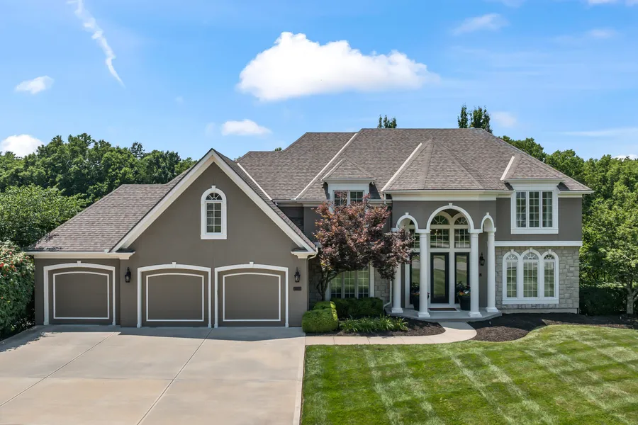 The wooden-covered bridge welcomes you into the coveted Holmes Creek Hills North Subdivision and immediately feels like HOME. Located just outside the city limits between Liberty, MO and Kearney, MO, the home blends country charm with city convenience in the Liberty School District. This stunning home sits on an estate lot and offers over 6,000 sqft of living space. Enter through a grand foyer with a curved staircase leading to formal dining and living rooms. The spacious kitchen features granite countertops, two walk-in pantries, and a cozy hearth room with fireplace. A home office, laundry room, drop zone, and a half bath complete main level. Upstairs, the primary bedroom has an ensuite bathroom with a walk-in shower & closet, dual vanity, and jetted tub, along with three additional large bedrooms all with walk-in closets and built-in cabinetry. A laundry chute offers extra convenience! The second staircase leads you to the tiered basement with two more bedrooms, bathroom, home gym, entertainment space, full bar and storage. The crowning jewel of this home is the outdoor space. The driveway wraps around the home into the lower-level suspended garage, ideal for entertaining. It's complemented by the oversized patio, deck, fire pit, and expertly groomed yard with a sprinkler system. The original owner, who was the builder, packed the home with extras. The current homeowner has maintained it with pristine care and many updates, making this home move-in ready. Recent updates include three new HVAC units, each heating and cooling every level of the home, a new septic tank, hard surface flooring on the lower two levels, rear siding replaced with cement fiber siding for maintenance-free years to come, a composite deck with wrought-iron spindles, fire pit addition, new paint throughout (interior and exterior), and many updated fixtures, hardware, and overall home updates. Come see for yourself. This property is one of a kind!
