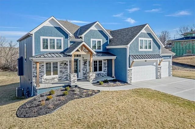 TALK ABOUT A MOTIVATED SELLER!! Bring your offer on this nearly new 1.5-story home! Custom built in 2023 by Patriot Homes, it offers 5-bedrooms, 4 1/2 baths with over 3600 sq ft of well designed finished living space. The main floor is flooded with natural light from the oversized windows and boasts outstanding features including hardwood flooring, 8' entry door & high ceilings plus a stunning 18' coffered ceiling in the Great Room, shiplap accent above the mantle and upgraded lighting fixtures throughout. A drop zone near the garage entrance has built-in bench with cubbies, laundry room on both the main floor and second level. You'll find built in storage in nearly every area, a chef inspired kitchen offering a oversized island with Quartz countertop and casual seating, gas cooktop & range hood and generous walk-in pantry for extra storage! The primary suite is private & spacious with a tray ceiling, window blinds, beautiful en suite bath including a free standing tub, separate shower with dual heads and large walk in closet. Other highlights include floor to celing bay windows with remote control blinds in the living room, upgraded Quartz countertops throughout, ceramic tile in wet areas, a covered 12'x18' wood deck off of the kitchen and zoned heating/cooling for energy efficiency and comfort. Upstairs, you'll find four more bedrooms and three full baths. Each bedroom is generously sized with a large closet and vaulted ceiling. Large 3 car garage is 22' deep and has 8' insulated steel doors. The unfinished walk out basement offers 12" foundation walls and over 2000 sq ft of potential for whatever your heart desires. This home is situated on a hard to find 2+ acre lot offering a wooded view from the back. Located in the North Kansas City School district and the desirable Staley High School attendance area.