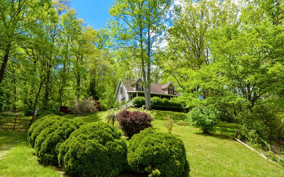 TIME FOR YOU, IN A NC MOUNTAIN HOME ON 2.67 ACRES! Surrounded by tall hardwoods & mountain & pasture views this home offers a flowing floor plan, a living room with stone fireplace, dining room, kitchen, master suite and laundry all on main level. Upper level features bedroom suite and open living area. Great outbuildings include rustic barn and potting shed. Full length screened-in front porch offers views and lots of room for relaxation. Room to build another home in the oak forest behind the house. COME KICK BACK IN THE NC MOUNTAINS!!