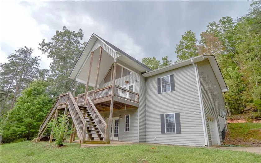 PRIVATE NORTH CAROLINA MOUNTAIN HOME!! Nestled in tall hardwoods, this 3 bedroom/2 bath home offers end of the road privacy with circular drive, paved road access, fenced in side yard, spacious kitchen w/granite counters & stainless steel appliances, beautiful blend of drywall & wood w/cathedral T&G pine ceiling & stacked stone gas log fireplace, walls of windows, large front porch w/mountain views, laundry & master bedroom w/trey ceiling & private side deck on the main, master bath w/walk-in tiled shower & jetted tub, customized walk-in closet, loft area, on the lower level is a living room, 2 huge bonus rooms, an unfinished bath, 1 car garage, workshop & more!!