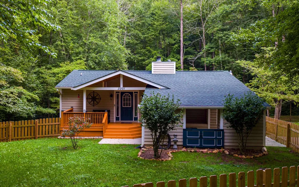 Nestled in tall hardwoods, this recently remodeled thoughtfully designed home offers rustic glam at it's best, an open floor plan, on the main level a master suite with exposed beams, sliding glass doors to the back deck & a sliding barn door to the master bathroom featuring granite counters with 2 sinks & a large glass walk-in tiled shower with dual shower heads, a living room with exposed beams, a wood burning fireplace, shiplap interior siding, a beautiful blend of wood & drywall, an open kitchen with a large island, granite counters, a farmhouse sink, stainless appliances, tiled backsplash, tons of storage, top grade light fixtures throughout, a second master suite & a living room + a workshop on the terrace level.