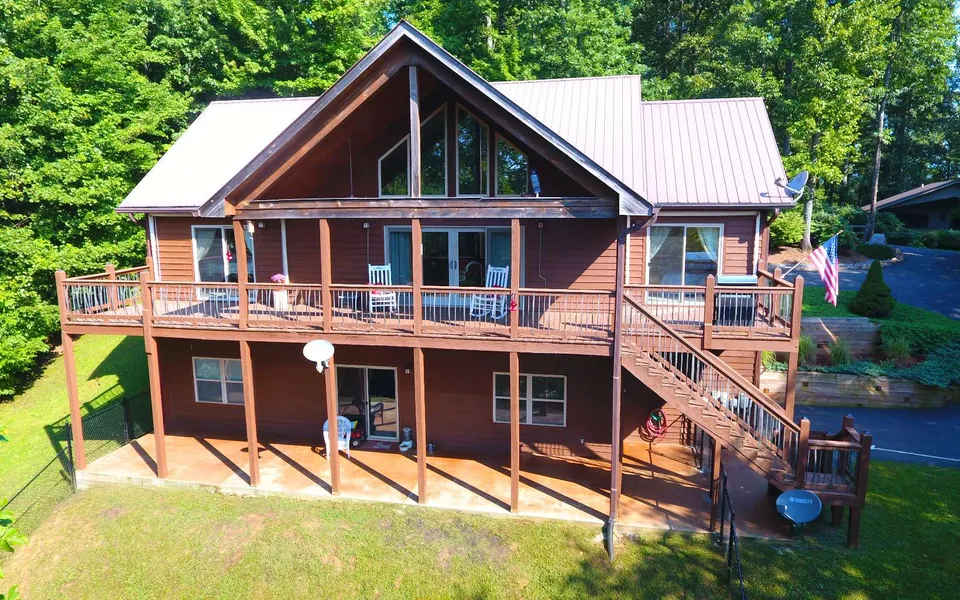 IT'S BETTER AT THE TOP! Privately located to 2 beautifully wooded lots, this mountain top cabin offers an open floor plan, 3 spacious bedrooms/ 3 bathrooms, a great room with cathedral ceilings, beautiful hardwoods, kitchen with quartz counters & custom cabinets & stainless appliances, great natural light, rocked corner fireplace, large breakfast bar, full dining area & wide glass doors out to the full width decks both covered & open with big mountain & lake views! Master suite, guest bedroom w/ bath & laundry room all on main level, downstairs you'll find a living room, another full kitchen, large guest suite, big garage with 2nd laundry & stairs to the upper decks.
