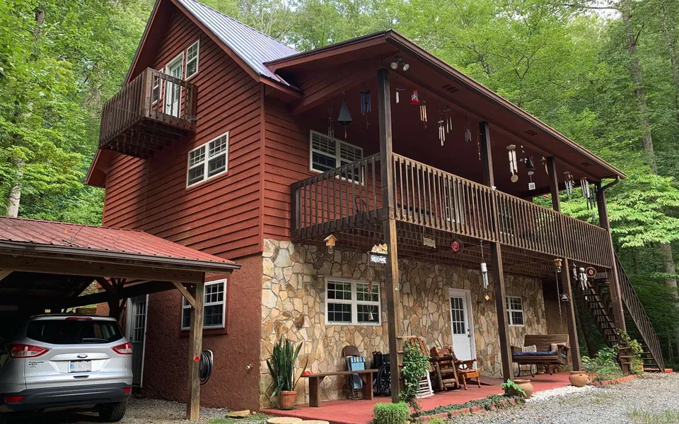 PRIVATE CABIN IN THE NORTH CAROLINA MOUNTAINS!! Surrounded by tall hardwoods this cabin offers end of the road privacy, beautiful wood & stone exterior, 3 bedrooms, 3 bathrooms, an open floor plan, great room with soaring cathedral ceiling, stone fireplace, large covered and open air deck, concrete patio, living room with wood stove, tons of storage, 2 car carport, outbuilding, picnic area PLUS an extra lot adding additional privacy.