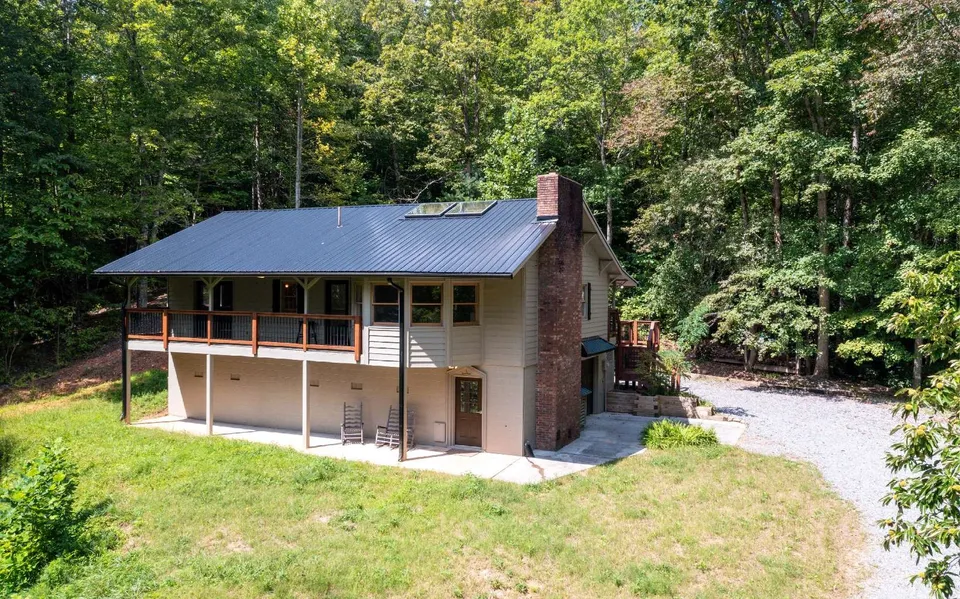 This Tusquittee Valley home is truly a gem, seamlessly blending the allure of mountain life with modern amenities and the potential for personalized touches. The thoughtful renovations highlight the beauty of the home's natural surroundings, and the two-bedroom, two-bathroom main floor is a haven for rest and relaxation. The master suite's French doors opening to a sunrise deck invite each day with a promise of peace, and the upscale finishes in the bathroom, including granite counters and a tiled shower, add a touch of luxury. The heart of the home, with its upgraded kitchen, grand stone fireplace, and vaulted ceilings with skylights, ensures that the great room is not only a spacious area for living and entertaining but also bathed in natural light. The covered front porch provides a sheltered space to absorb the tranquility of the valley. An unfinished ground level offers immense potential for customization, making it a canvas for your imagination. The outdoor space, flanked by spring-fed creeks and an open garden area, presents numerous possibilities for additional structures or leisure areas, while emphasizing privacy and connectivity with nature. Positioned conveniently near historic Hayesville, this residence offers an idyllic balance between seclusion and access to community amenities.