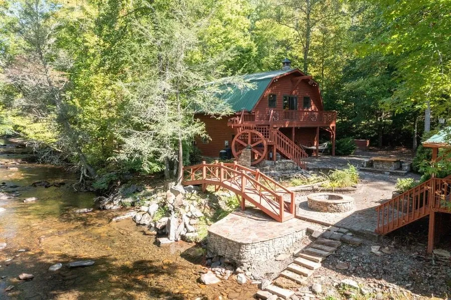 FABULOUS CREEK FRONT RETREAT ON 2.07 ACRES with on one of the BEST trophy trout waters in the area! 5BR/8.5BA. Spacious Main Lodge has Gathering Room with cathedral ceilings, stone fireplace, and open to sunroom overlooking beautiful cascading Fires Creek. Bonus rooms, library, and more make this main house perfect for large groups. Outdoor areas feature covered porches and balconies overlooking huge courtyard constructed of brick pavers, creek front fire pit, water wheel & waterfall area, and picnic tables. Guest house with rec room. Horse barn with overhead bonus room/office and RV site. Exceptional lodge-style furnishings throughout. Opportunity of a lifetime for perfect family or corporate retreat. Total septic system capacity is 5 BRs.