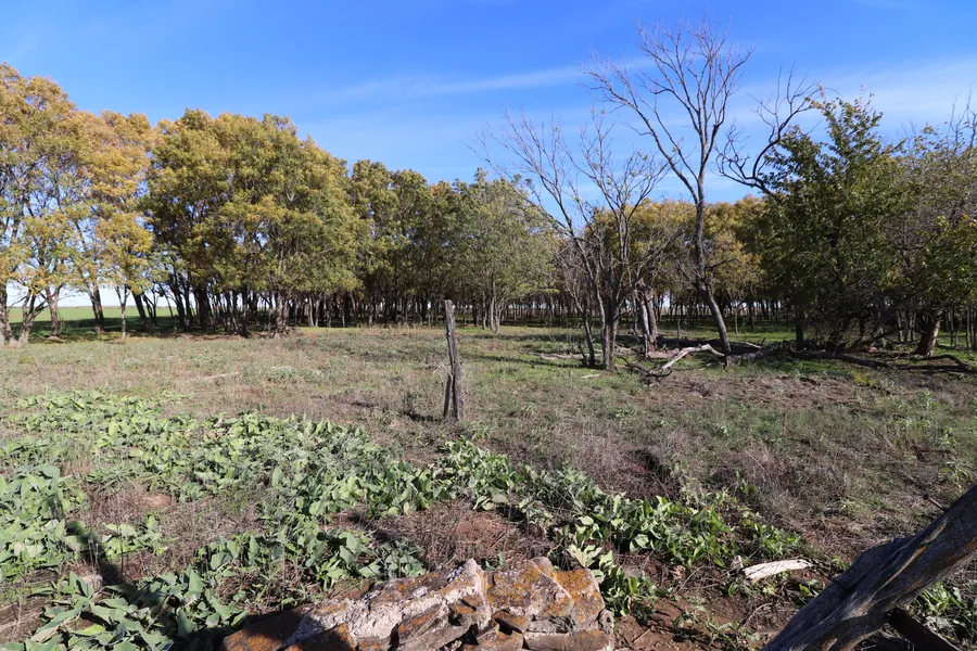 Vegetation: Small grove of native Hackberry and Elm trees line wheat field. Some scattered mesquites in pasture. Excellent varieties of native bunch grasses. Wheat field for hay production and winter grazing.