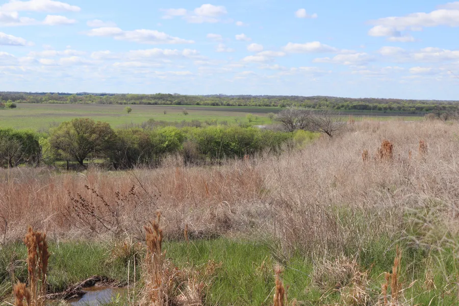 Terrain: Flat to rolling high ground feeding ponds. Approximately 50% cultivated wheat with 50% native grass pasture and mixed hardwood timber along creek bottom.