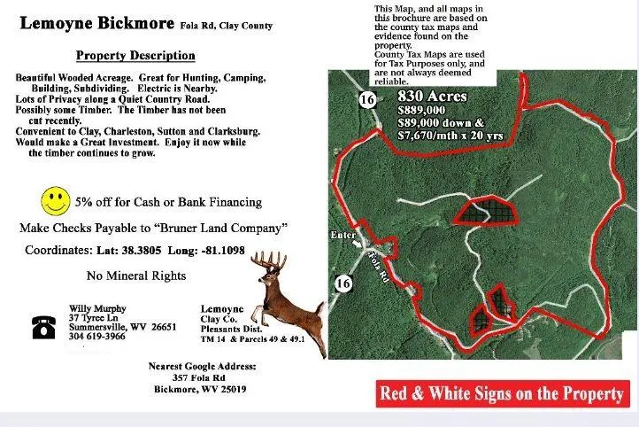 FOR SALE: 830 acres located near Bickmore in Clay Co. WV. If you are looking for a large tract for building, hunting, camping, recreational and would be great investment. This tract is all wooded and has a great young growth of timber that will be ready to harvest in the next 10 years or so. Property in convenient to Clay, Charelston, Sutton and Clarksburg. Electric is nearby and it has great access. Mineral rights do not convey as they was sold off years ago. Priced at $889,000.00 "OWNER FINANCING AVAILABLE with NO CREDIT CHECKS and No Penalties for early payoffs." With at least $89,000 Down plus a $500 Doc. fee up front and monthly terms up to 30 years. If you are paying cash or going through a bank for the full amount I can take 5% off.