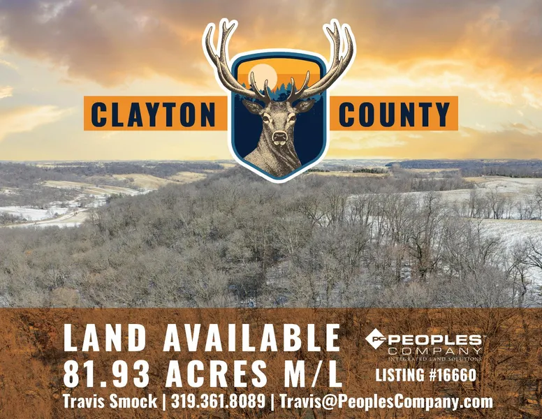 Offering 81.93 acres m/l of diverse Clayton County farmland on a hard surface road. This property offers something for everyone including income-producing tillable land, recreation land, and potential future building sites. There are currently 45.13 tillable acres carrying a CSR2 of 49.5 with the top soil type being the very productive Fayette silt loam. An additional 8.81 acres m/l currently fenced for pasture could be sodbusted for a total of approximately 53.94 tillable acres. This property is positioned in the perfect part of the world for whitetail deer hunting and offers ample food and timber cover with water locatedjust to the west at Kleinlein Creek. There are three wide access drives off Highway 13 with beautiful hilltop views creating opportunities for multiple building sites. The farm is located just 2.5 miles north of Strawberry Point in Section 2 of Cass Township, Clayton County, Iowa.
