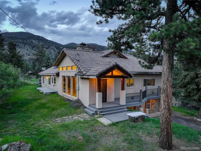 0.5 mi to Upper Bear Creek " 1.6 mi to Evergreen Lake " Second kitchen suite " Hot tub & fire pit Stunning mountain retreat in Evergreen's Circle K Ranch, offering panoramic mountain views and versatile multigenerational living. This beautifully remodeled raised ranch sits on 1.39 acres of usable land with mature trees, southern exposure, and a paved driveway for year-round access. The mountain-contemporary design features stucco and timber accents, a Class A fire-rated concrete-tile roof, and multiple outdoor spaces including covered and wraparound decks ideal for stargazing or sunset watching. Inside, the great room impresses with 12-foot ceilings, a wall of windows, and a dramatic floor-to-ceiling river-rock fireplace. The chef's kitchen features slab-granite countertops, Thermador gas range and double ovens, cherry soft-close cabinetry, and a large pantry with stand-up freezer. The main-level primary suite opens to a private deck and includes a luxurious 5-piece bath with jetted tub, marble-tiled dual shower, and dual vanities. Two additional bedrooms, two baths, and laundry complete the main level. The finished walk-out lower level adds a second kitchen with radiant-floor heating, two bedrooms, a full bath, and a family room opening to a patio with hot tub and fire pit-ideal for guests, rental income, or extended-stay living. Additional highlights include a workshop, bear-proof doors, and heated unfinished area with conversion potential. Minutes to Evergreen Lake, golf course, Dedisse Park trails, and downtown Evergreen with quick I-70 access to Denver and the mountains. Includes 3D and video tours.