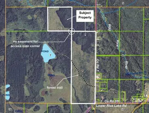 Large acreage near hundreds of acres of public land and county memorial forest land. Wild Rice River just to the north. Lower Rice Lake to the southeast. Nearly all upland. Paved Co Rd 7 runs along the east boundary of the contiguous 120-acre segment. A healthy, growing pine plantation on the property will be a source of income in future years.