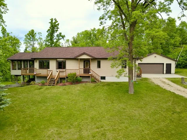 Where can you find this kind of privacy with more than 6 acres and 440' of gently sloping hard bottom lake shore? 3+BR ranch style with walkout basement was built in 1995. Main level living has some handicap accessibility. Hickory cabinets, vaulted ceilings, 3 season porch. Walk out basement has a workshop, excellent storage and guest room. Extra 30x40 pole building.