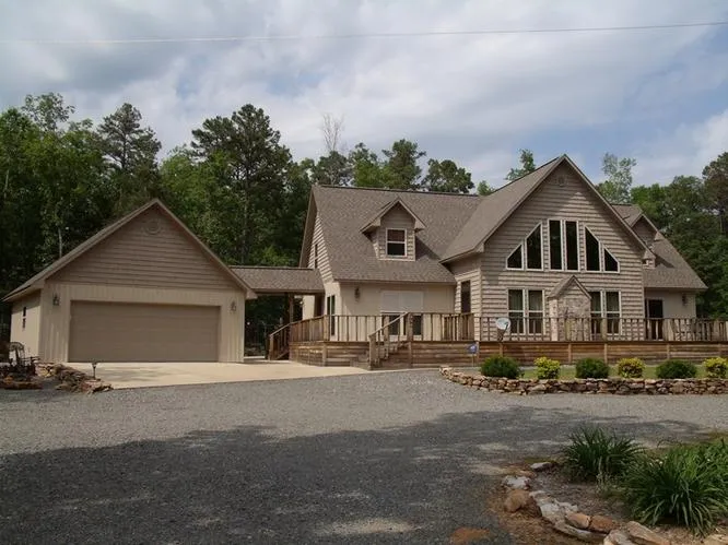 Beautiful large home across the street form the lake. Large front deck and patio in rear. Large master bedroom with walk-in closet. Game room, and den. Two spacious bedrooms upstairs with generous closet space. Separate heating and AC unit for upstairs. Vaulted great room with gas log fireplace. Large kitchen with lots of cabinets and breakfast bar. Detatched two car garage with covered walkway to the house. Covered boat slip in community dock included.