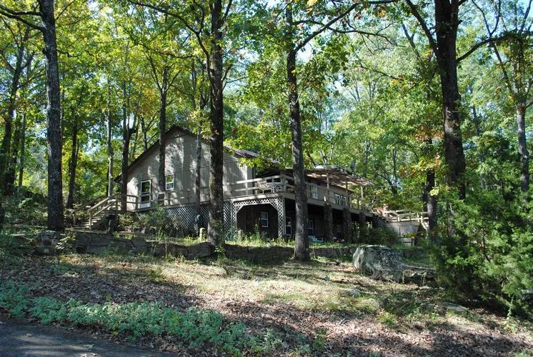 Wonderful lakefront home with exceptional lake view. Concrete and & stone steps lead down to the water. Open floor plan with greatroom and huge master bedroom overlooking the lake. Wood burning fireplace in greatroom. Two bedrooms and bath and additional den down stairs that could be a 4th bedroom. Pecky Cypress tongue and groove paneling through out the home. Large deck across the back and patio below. Separate shop. Well landscaped and with lots of boulders.