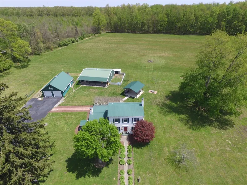 Fall in love w/this 2 BR farmhouse on nearly 11 partially wooded ac. Study could be 3rd BR! Oversized 2 car garage w/plenty of storage, a balcony off the back, overlooking your property. 30x40 Pole Barn w/workshop & patio for relaxing. Enjoy entertaining under the covered shelter w/ceiling fan & fireplace. Master BR w/ full bath and walk-in closet.