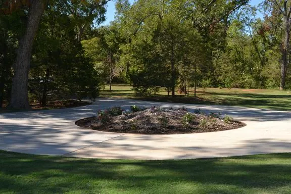 A winding driveway through the beautiful wooded property culminates in a circular drive at the front of the house.