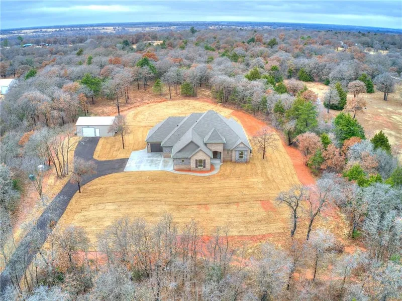 Secluded in the beautiful woods! Come up the lovely winding, shaded, driveway to your personal sanctuary! Leave the cares of the world behind! Quality construction combined with choice land and location! Quick to TAFB, OKC, Norman, I240. 2 min to 13 mi Draper Lake biking/walking trail.Open floor plan; lg island; huge walk in pantry-sliding barn door. 3cm granite counters accent custom cabinetry and stainless appliances; custom copper island sink; natural stone and porcelain showers & tub areas. Great room and back patio have cathedral ceilings. Office. Elegant staircase from gallery entry leads to media room/bedroom and bath upstairs. Hand scraped walnut wood flooring most of home! Natural stone & granite counters thru-out. Crown molding; bedrooms have designer ceilings. Master~ huge walk in closet, separate shower and jetted tub. Hm has individual water line cut offs. 25x30 metal shop w...