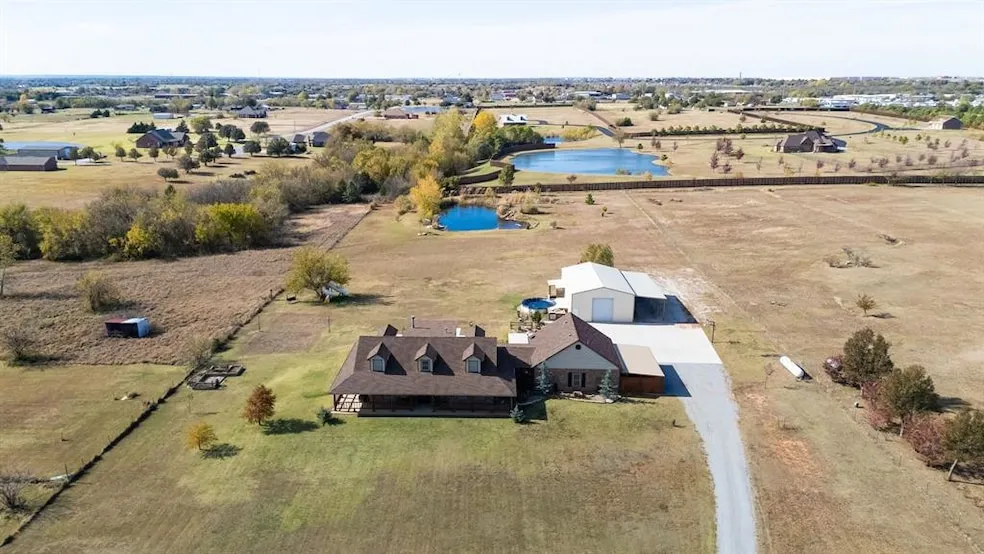 Welcome to 10015 Southern Creek Your Dream Home Awaits! If you've been searching for the perfect blend of country living, ample space, and luxurious amenities, look no further! Nestled on over 5 acres of picturesque land, this charming 4-bedroom, 3.5-bathroom home offers everything you need and more. As you approach the gated property, you'll be greeted by a welcoming wrap-around porch, perfect for enjoying the peaceful surroundings. Inside, the spacious living areas are designed with comfort and style in mind, including an upstairs flex space that can be used as an office, playroom, or additional living area. The primary suite is conveniently located on the first floor and features its own private access to a covered patio an ideal spot to unwind after a long day. The open-concept design flows effortlessly from the living room to the kitchen, making it a great space for family gatherings and entertaining guests. Step outside and discover your own backyard oasis! With a volleyball area, kids' play space, and a refreshing pool, there's something for everyone to enjoy. The outdoor covered patio is ready for your BBQs and outdoor dining, and on cool evenings, you can relax by the outdoor fireplace. Love nature? You ll adore the serene, stocked pond, complete with a waterfall, small dock and a swing where you can sit and soak in the stunning sunsets. Whether you re fishing, relaxing, or just enjoying the view, this is truly a retreat you ll never want to leave. Need storage space? This home has you covered with a 3-car attached garage with a half bath, a large 30x50 shop for all your hobbies or projects, and a covered parking area for your RV or additional vehicles. Easy to get to Stanley Draper Lake, OK Heart Hospital, Tinker AFB, and so much more. With its perfect combination of tranquility, space, and amenities, 10015 Southern Creek is the home you ve been dreaming of. Don t miss your chance to make it yours schedule a showing today!