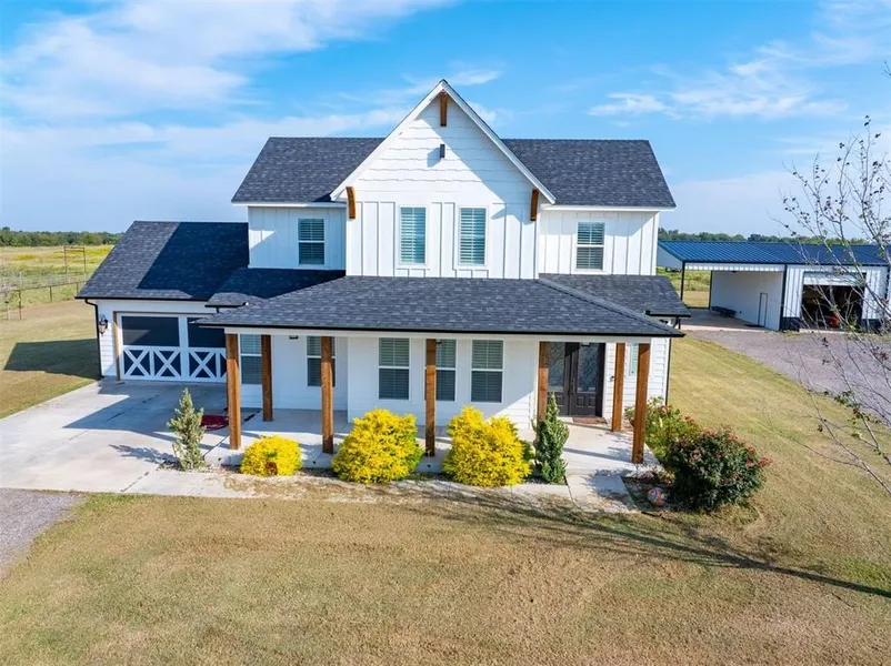 What a unique opportunity to own a modern farmhouse on 40 acres (MOL)! The property was recently active for cattle and equine with a roping area and some fenced and cross fenced pastures. The home, built in 2022, is quite lovely with a classic farmhouse look at first glance featuring a front porch that spans the full width of the home! Inside tells a different story, with the modern amenities and luxury features that should be enjoyed in the country, not just the city. Upon entry, the floorplan is open offering plenty of windows that invite loads of natural light and are finished out with custom plantation shutters. There are numerous high-end finishes throughout the home, such as oak hardwood floors, a solid wood fireplace mantle, custom kitchen cabinets W/ custom drawers, stainless appliances plus a warming oven & ice maker, AND gorgeous granite counter and island tops in the kitchen. The Primary suite is on the lower level and offers plenty of space for your furnishings and a spa-like bath with a large shower and walk-in closet. The laundry is pass-thru to the primary suite walk-in closet and a mud room with exterior access off the kitchen. The upper level offers a good size media/game room space and 3 additional bedrooms, 2 of which have bathrooms and walk-in closets. With a 2 car attached garage, plus a 40'x40' shop with 3 overhead doors, and a 20'x40' carport area off the shop, there is more than enough room for your equipment, boat, RV, or what other toy(s) you might need to keep out of the weather. To complete this package, there are 2 ponds on the property, a chicken coup and gardening area that is ready for your green thumb! Come see this paradise and you won't want to leave!