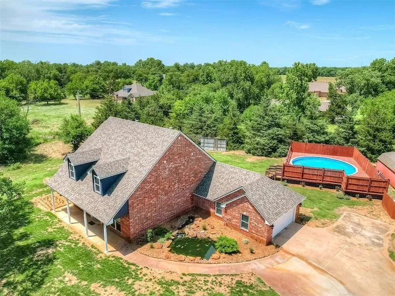 This property has so much to offer! With 5 bedrooms, 3 bathrooms, 3 separate living areas, an above ground pool, pole barn with well water and electric and over 9 acres (mol) for your privacy and enjoyment. The large primary bedroom is located downstairs and the ensuite offers double vanities, walk in shower, clawfoot bathtub and walk in closet. Two other bedrooms are also located downstairs, perfect for an office or small children you want to keep close. Be sure to check out all the closets, they are HUGE! There is a second downstairs full bathroom. The living, dining and kitchen is all open concept. The kitchen has beautiful granite counter tops, gas cooktop, double ovens, built in microwave, refrigerator (will remain with the property), and large walk in pantry. There are two bonus rooms upstairs, two bedrooms and a bathroom with shower. Most of the interior has been recently painted, new roof in 2024, new laminate flooring downstairs 2024, new carpet upstairs and many more updates. Home is located off of I-35 and Hwy 9 exit #106, close to Riverwind Casino.