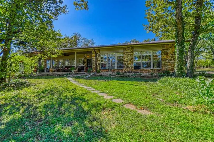 A tree lined drive opens up to rolling pastures and a charming stone home with a spacious covered patio over looking a large pond privacy. A perfect mix of pasture and in the back 20 Ac heavier trees many pine trees. 2 Metal barns one with 4 stalls, tack room, feed room and 3 outdoor paddocks, large overhang, the other barn has a 1 car garage door and extra open storage . One acre pipe and horse fencing paddock 8X8 in ground storm shelter. A great unique floor plan,2 wood stoves, a very spacious living room with built-ins and kitchen with ample storage, a sun filled large patio room welcomes you with natural light and GREAT view. Walk in pantry off mud room this home has so much storage. We have an Appraisal on file done 10/20/21. All Appliances stay. Needs a few hours notice to show. Click Virtual tour for a lot more photos, openhouseok.com