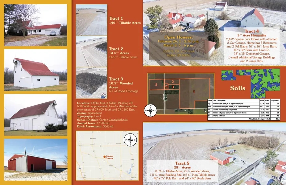 Building Description: Tract 4: 2,472 sq. ft. Home & Attached 2-Car Garage Home has 5 Bedrooms & 2 Full Baths Horse Barn 52' x 36' Barn with Lean-to 40' x 36' Detached Garage 18' x 18' 5 Small Storage Buildings 2 Grain Bins Tract 5: Pole Barn 48' x 72' and Block Barn 24' x 40'