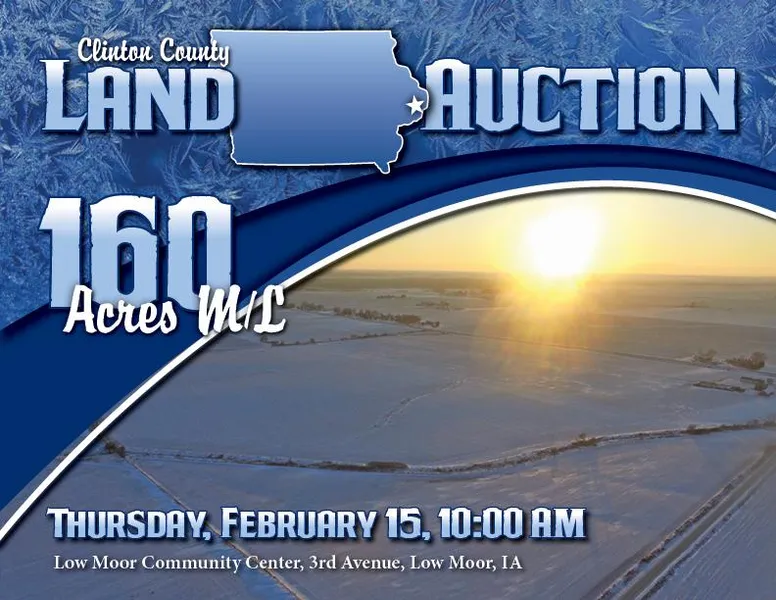 AUCTION - 160 ACRES M/L Feb. 15 at 10:00 P.M., Low Moor Community Center, 3rd Ave., Low Moor, IA. Farm includes approximately 148.10 FSA tillable acres carrying a CSR2 of 83.5. High quality soil types include Tama and Muscatine silt loam. The property is located in Section 2 of Camanche Township in Clinton County, Iowa. The farm includes a house and buildlings on the Northwest corner of the property.