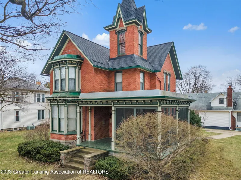 This beautiful turn of the century home known as the 'Roswell C. Dexter House of Saint Johns, MI' is registered as a historic place with the Michigan Historical Commission. Most of the historic intricate details have remained intact; original doors some with brass hinges, plantation shutters, antique beveled leaded glass windows, mitered corner hardwood floors, brick exterior with limestone trim and third story tower. On the main level you have a beautiful entry foyer with stairs to the second story, and a wood arch trimmed door to the sitting room that is open to the living room. The living room has an art deco style surround to the fireplace and entrance to the office/first floor bedroom, and glass paned wood doors to the dining room. The dining area has cabinetry built into the bay window with leaded beveled glass transom window, a second entry to the office, access to first floor ful...