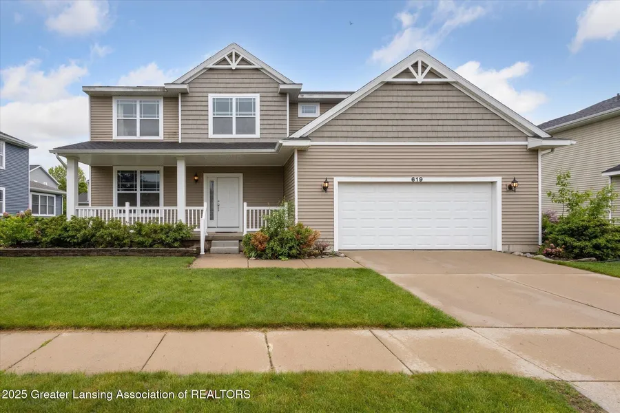 Nestled in the desirable Hawk Nest neighborhood of East Lansing, 619 Willet Way offers a spacious and well-maintained home ideal for expanding families. The main floor features 10 ft ceilings throughout. The open concept layout connects kitchen, dining area, and living room. Beautiful bamboo flooring, stone surface kitchen countertops, and a wall of windows provides ample natural light in the living area. The first-floor den with French doors could also serve as a dining room. The second level is complete with 4 bedrooms, including a spacious primary bedroom with ensuite, and a flex room perfect for a family room, study space or gaming area. 2nd floor laundry includes a utility tub. Sliders off the kitchen lead to a large custom Trex deck with steps down to the fenced back yard. Lower level has generous amounts of space and is complete with an egress window and stubbed for a full bath giving future owners many possibilities.