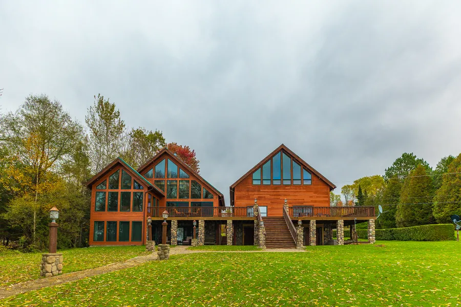 Discover this Adirondack lakeside retreat with nearly 100' of sandy beach on Upper Chateaugay Lake. The main house, a charming cabin, features a renovated kitchen with a double oven, coffee bar, dining and living rooms, and a cozy bedroom with full private bath. A mudroom and laundry room help make lake life more convenient. The suite upstairs faces west, and the tall custom windows offer breathtaking panoramic views of the mountains and lake. Connected to the cabin by an expansive deck, the lodge's rustic great room invites you to relax around the double-sided floor to ceiling stone fireplace. The lodge, with its lake-facing windows, cathedral ceilings, and sound system, is perfect for entertaining or relaxing with family. The corner bar stands ready to serve breakfast or your favorite drinks. Downstairs, an owner's suite with full gym, laundry, and luxurious tile shower provide comfort...