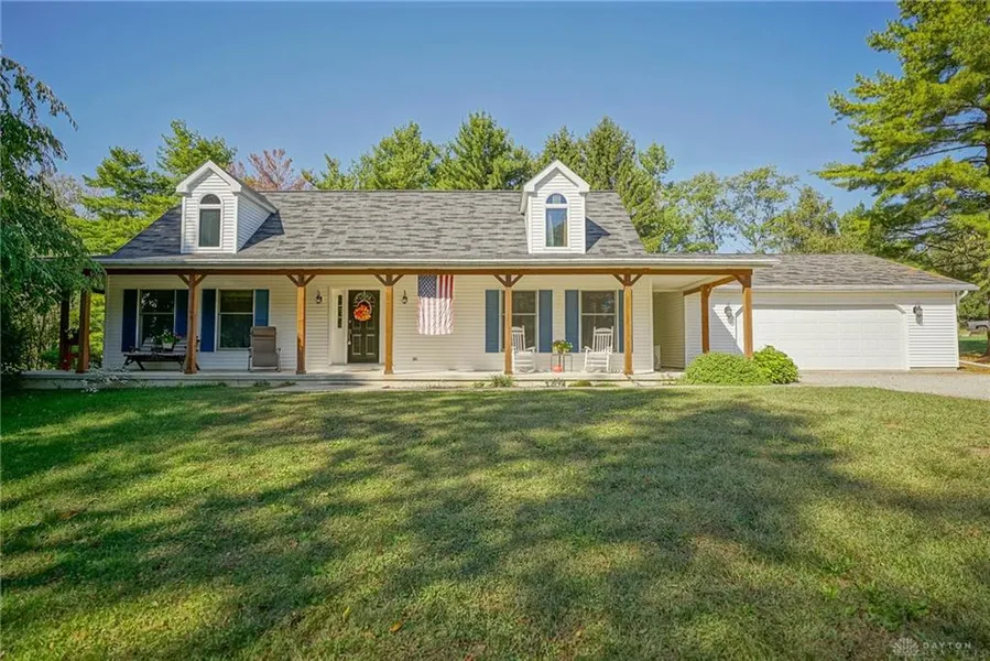 A picturesque Cape Cod home with a wrap-around porch on a beautiful partially wooded lot with a stream running past. *CLICK ON THE CAMERA REEL/VIRTUAL MEDIA LINK to preview the pictures and video.* Imagine yourself relaxing or entertaining in this country home on this private lot. The house offers 1872 square feet, NOT including the unfinished basement. The garage is oversized with a built-in storage shed on the back. Renovations include Master bath 2019, 2nd story bath 2018, 1/2 bath 2017. New glass block windows in the basement. Floors replaced with laminated wood flooring on the 1st floor. Fridge new in 2018 and all other appliances less than 5 years old. The home is 15/20 minutes from Caesars Creek and Cowan Lake. Dayton and Cinci is 45 minutes and Columbus is an hour.
