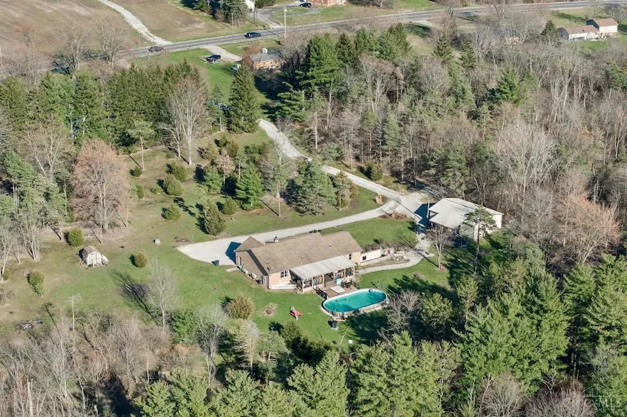If you love to entertain, this is the home for you! Seclusion is the name of the game as you drive back the gated driveway to your own little oasis. Main level has almost 1900 sf and is over a full basement with 9' ceilings. Enter the great room from the covered front porch with cathedral ceilings and wood burning fireplace that is open to dining and kitchen. Split floor plan offers Primary bedroom and bath on one side and 3 bedrooms and a full bath on the other. All with large closets. Basement is mostly finished with large recreation area, built-in bar, and full bathroom. Large laundry and utility area also in basement. Exterior entry walks into side yard. Access the back entertainments space through the back door from the dining area onto an ample, covered porch that overlooks the very nice above ground pool that has a heater/cooler. A 30x40 pole building with concrete floor and electric tops the property off.