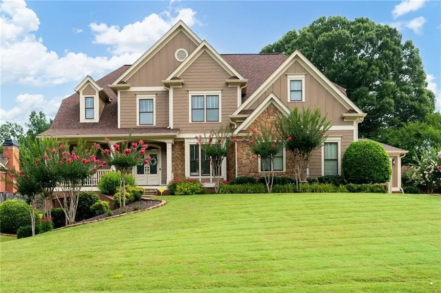 From the inviting rocking chair front porch—featuring a beautiful blend of brick, stone, and shake siding—to the incredible landscaping and elegant double-door entry opening into a grand two-story foyer, every detail invites you in. Inside, the upscale trim work and attention to detail are sure to impress. The open dining room can accommodate gatherings of any size and boasts a gorgeous tray ceiling. A stylish butler’s pantry with granite countertop and glass-front cabinetry provides the perfect space to display stemware or serving pieces. The main-level primary suite is a private retreat with a cozy sitting area, hardwood floors, double tray ceiling, spa-like bath, large walk in closet and private access to the exterior deck—perfect for morning coffee or unwinding in the evening. Modern whitewashed hardwood floors flow throughout the main level, enhancing the bright and open floor plan. The two-story family room features a dramatic wall of windows and a stately fireplace, flooding the space with warmth and natural light. The chef’s kitchen includes granite countertops, stainless steel appliances, double ovens, 5-burner gas cooktop, recessed lighting, upgraded designer fixtures, a coffee bar, breakfast bar, and a breakfast area with bayed windows and access to the back deck—ideal for everyday living and entertaining. Just off the kitchen, the cozy keeping room showcases a second fireplace and elegant coffered ceilings—an ideal spot to relax with family or friends. Also on the main level is an exceptional laundry room, complete with cabinetry, utility sink, laundry chute, and custom wall accents perfect for organizing backpacks, jackets, and even dog leashes. Upstairs, you'll find three spacious bedrooms, each with private en suite access, plus a generous flex space that can serve as a home office, playroom, hobby area, or anything else your lifestyle demands. The finished terrace level offers endless possibilities, including a large rec room, additional bedroom, full bath, multiple bonus rooms, and ample storage space. Terrace level patio offers more relaxing / entertaining space. 12 Zone Irrigation System! A 3-car garage and unbeatable location in a beloved neighborhood top off this incredible home. Conveniently located near shopping, dining, theaters, Downtown Acworth, grocery stores, gas stations, and top-rated Cobb County schools: Frey Elementary, Durham Middle, and Allatoona High.