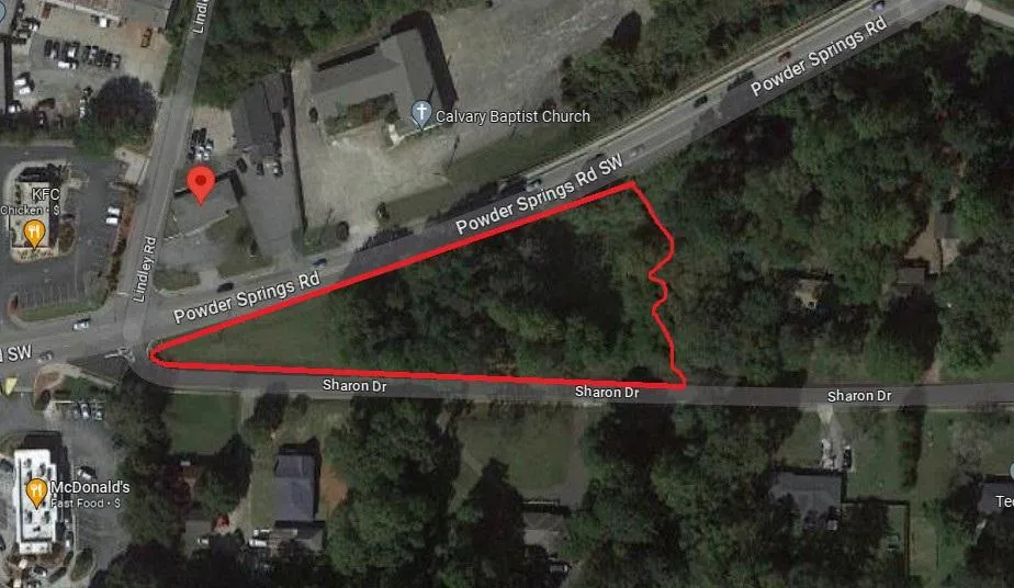 Triangular +/- 1.27 acre tract on Powder Springs Road. Potential commercial lot across from large church, fast food restaurants, professional offices and body shop.