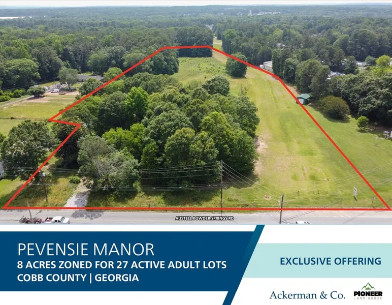 Ackerman & Co. and Pioneer Land Group are pleased to present Pevensie Manor, 8 Acres in Cobb County, GA zoned for 27 active adult single family detached (SFD) lots. Cobb County continues to be an extremely strong and growing residential market.