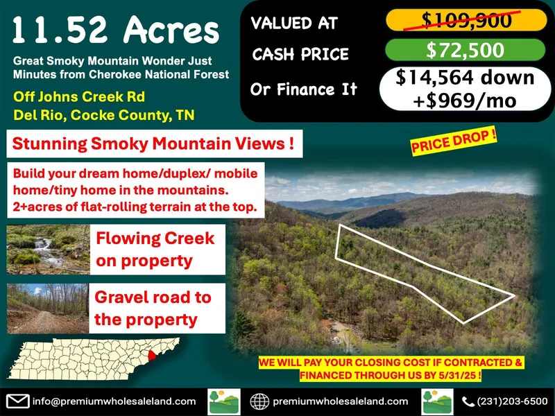 Tucked away off Johns Creek Rd in the peaceful mountain community of Del Rio, TN, this 11.52-acre property is your chance to own a slice of East Tennessees rugged beauty. Located just 20.7 miles southeast of downtown Newport, this secluded lot offers privacy, scenic terrain, and incredible natural surroundings perfect for a private cabin, a weekend retreat, or your dream mountain getaway. With elevations ranging from 2,080 to 2,520 feet, the property boasts dramatic views, wooded slopes, and the untamed charm of Appalachian landscapes. Its close proximity to Cherokee National Forest means hiking, hunting, fishing, and camping are just minutes away. The gravel/dirt road leads to the top of the property which has 2+ acres of easily buildable, gentle terrain with breath taking mountain views. Why invest in Cocke County, TN? The area is known for its outdoor adventure opportunities, low property taxes, and peaceful rural living. Whether you're looking to escape city life, invest in raw land, or build a rustic retreat, this tract offers freedom and flexibility in one of Tennessees most scenic and undervalued regions. Don't miss the opportunity to own your own mountain escape!