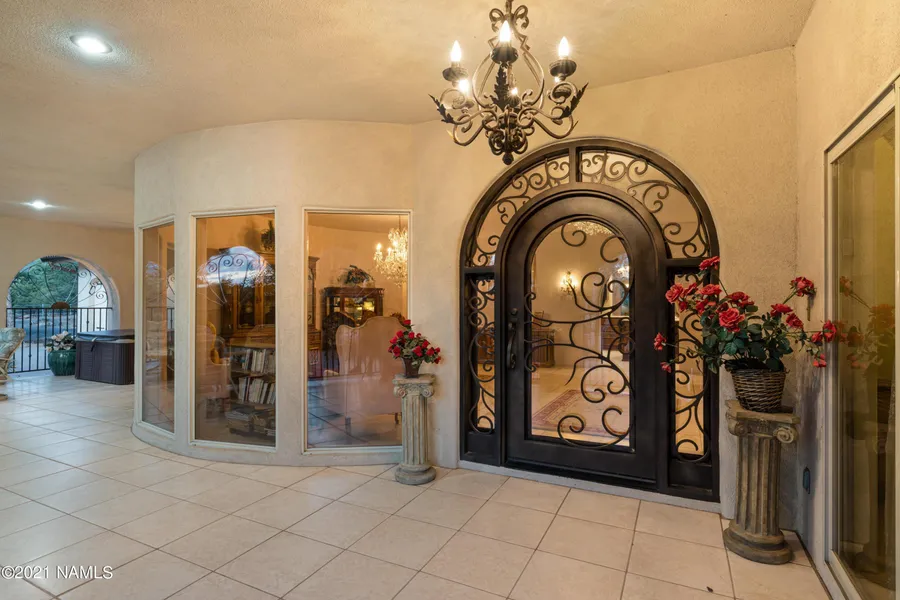 Inside the main residence, you'll be greeted by a $5,000 custom Italian wrought iron door. The interior boasts heated tile floors, stunning rock archways, and crystal chandeliers. Three extra-large master suite rooms feature patio access and full bathrooms, with three fireplaces providing warmth and ambiance. The living room's fireplace can be enjoyed both indoors and on the patio.