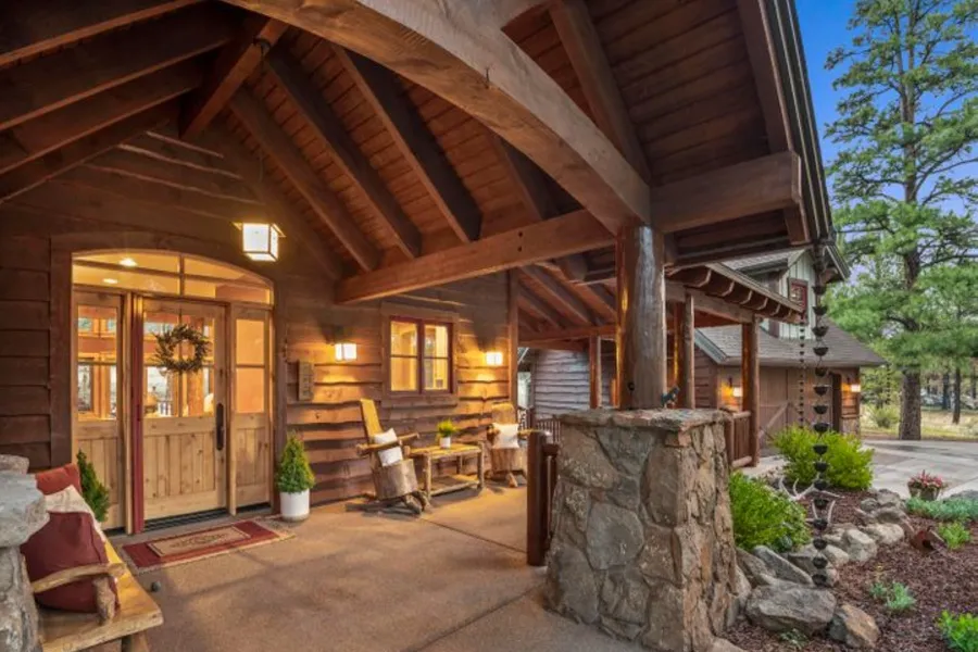 This quintessential mountain-luxury home in quiet Pine Mountain Estates features secluded forest views with so many quality upgrades. The custom lodge-style home showcases a magnificent entry to an expansive covered porch with ample space for seating areas to relax among the pines. Walk into the beautiful foyer, with vaulted T&G wood ceiling beyond in the great room and a malpais stone fireplace. The well-appointed kitchen boasts a 6- burner Jen-Air cooktop stove, stainless steel appliances, and granite countertops. Hickory floors, interior log detail, travertine and slate flooring, as well as Alder cabinets and doors are throughout this stunning home. The primary bedroom located on the main floor includes French doors to the beautiful covered patio with outdoor fireplace,