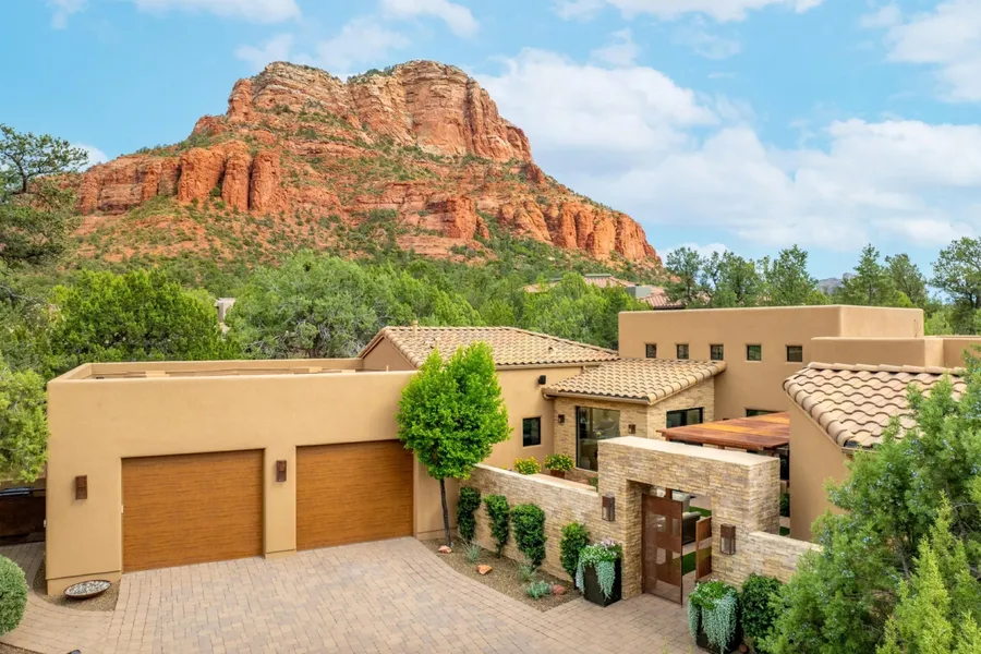 This meticulously crafted Mystic Hills residence seamlessly blends the splendor of nature, contemporary architecture & fantastic Red Rock views of Elephant Rock, Cathedral Rock & more. Built in 2014-this home highlights: exquisite finishes, unmatched amenities, framed RR views, privacy & features a 2495 Sq Ft main residence + a 352 Sq Ft Casita/Studio, 4 BR, 3.5 BA & includes the adjacent parcel, approx. .95 acres in total. The privacy is enhanced via the three gorgeous courtyards, creating the feeling of a luxuriant enclave. Every corner of this home has been thoughtfully designed, from the expansive floor to ceiling windows, natural stone walls & designer fixtures. Impressive quality throughout! This one-of-a-kind home is straight from the pages of a magazine. See the supplemen