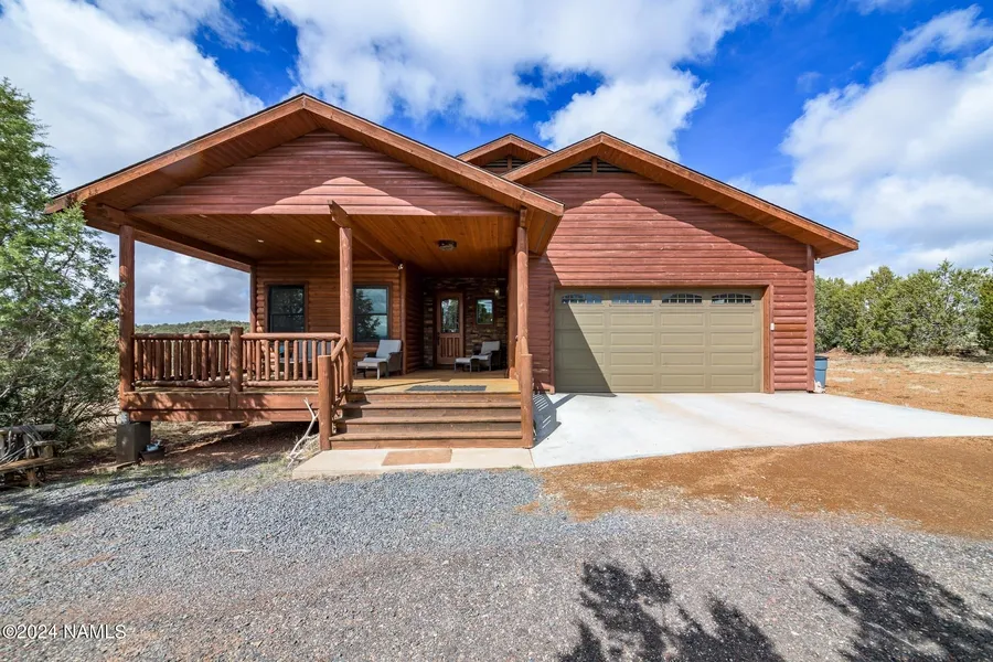 Discover this stunning custom-built home situated on 10 acres of picturesque land in Ashfork. The residence features exquisite solid oak wood floors, elegant porcelain tiles, and unique live edge window and door trim. Inside, you'll find vaulted log beams and tongue and groove ceilings, enhancing the rustic charm of this custom cabin. The thoughtfully designed split floor plan includes amenities such as air conditioning, a luxurious soaking tub, a pantry, and spacious covered decks at both the front and back of the home. Additionally, the property offers a separate studio/workshop with a loft, perfect for late-night projects, and a convenient storage shed. Come and experience this exceptional property for yourself!