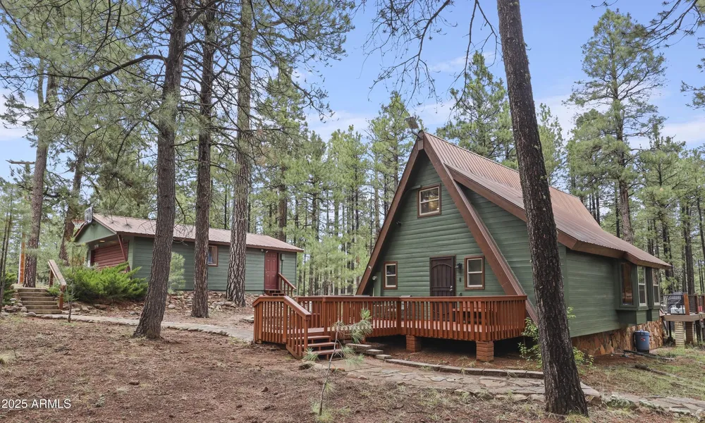 Discover your perfect high-country getaway tucked away on a quiet cul-de-sac, just one property away from the breathtaking expanse of the National Forest. This charming updated modified A-frame cabin is on just over an acre in the highly desirable Forest Lakes community—only 2 hours from Phoenix and a refreshing 30 degrees cooler in the summer! Step inside and be greeted by soaring vaulted T&G ceilings, a cozy freestanding fireplace, and an abundance of natural light from oversized windows, bringing the outdoors in. The completely renovated kitchen features stylish two tone cabinets, granite countertops, updated SS appliances and induction range (new in 2023). There is beautiful new durable laminate flooring that flows seamlessly across the entire home. The spacious upstairs loft bedroom has been upgraded with a new half bath and a generously sized closet for added convenience and privacy. The cabin has new energy-efficient windows and a mini-split AC/heat system for year-round comfort. Enjoy the outdoors on your brand new 16' x 32' Trex rear deck, perfect for entertaining, stargazing, or relaxing with a morning coffee. A newly installed gated fenced area provides a secure space for pets or kids to play. This home is designed with efficiency and longevity in mind, including a durable metal roof - ideal for all seasons, offering low maintenance, & long term protection from the elements. For those needing storage or workshop space, the deep two-car garage offers ample room for cars, tools, and recreational gear - perfect for full-time living or weekend getaways. The properties location offers exceptional recreational opportunities with several notable attractions nearby. Willow Springs lake is 5 miles away, and the renowned Woods Canyon lake just 8 miles away. The iconic Mogollon Rim, with its dramatic vistas, is also within easy reach. With great access, this location is ideal for fishing, boating, kayaking, picnicking, swimming, riding quads, and the list goes on. This cabin checks all the boxes for mountain living - privacy, efficiency, style, space, and comfort!! SEE DETAILED IMPROVEMENTS UNDER PHOTO TAB.