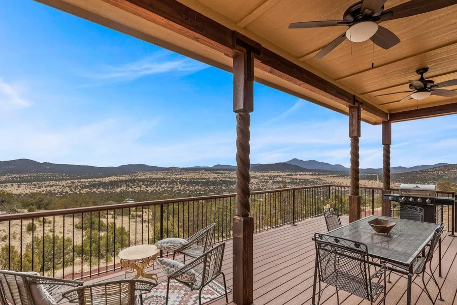 Stunning panoramic views and amazing privacy awaits you! On a 13.73 acre lot this hillside home is bathed with southern exposure! Passive solar can add to your comfort in winter and at 6,900 feet of elevation (with AC) adds to your summer enjoyment. When entering the home, you will be enveloped by natural light and with 22-foot-high ceilings (12-feet in bedrooms) the home feels spacious. Extraordinary details such as concrete flooring, raw edge Mesquite wood fireplace mantle, Granite Moon White countertops in the kitchen, stainless-steel appliances, tons of custom cabinets and beautiful tilework in each bathroom. The exterior is Stucco (synthetic), hand-carved Santa Fe turned wood posts and sunbursts above the windows, clay tiles and metal roof and an absolutely amazing deck for viewing wildlife, Kaibab and BLM National forests. The deck is the perfect place for stargazing, sunrises and ...